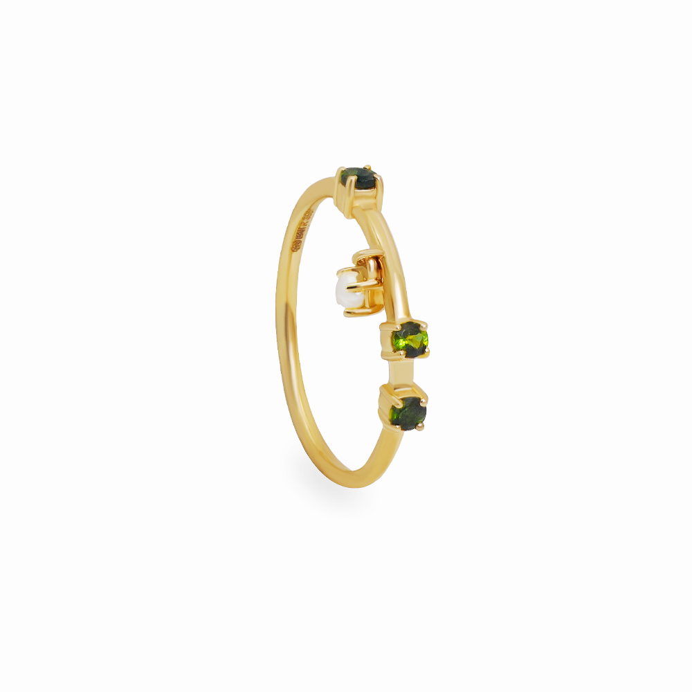ذهب أصفر عيار 18 (1.23 جرام)، وتورمالين أخضر (0.026 جرام)، ولؤلؤ بحريني طبيعي (0.01 جرام) تقريبًا.